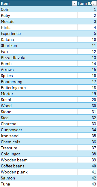 Thank you for sharing the XOR key, very useful! I managed to change quite some things, including the costs for upgrading buildings by looking for item ID, value, item ID, value, item ID, value, etc. In the specific combination of the building upgrade of course. Here are the item ID's I have found so far: I have had zero luck editing the warehouse or shop though. I've looked for just my values, and managed to find some addresses, but changing them or freezing them does nothing. Looking for XOR values does nothing most of the time. Even fuzzy search resulted in nothing in the end. How did you manage to set the limit to 5000 for example?