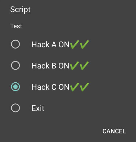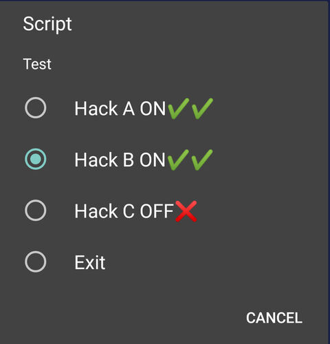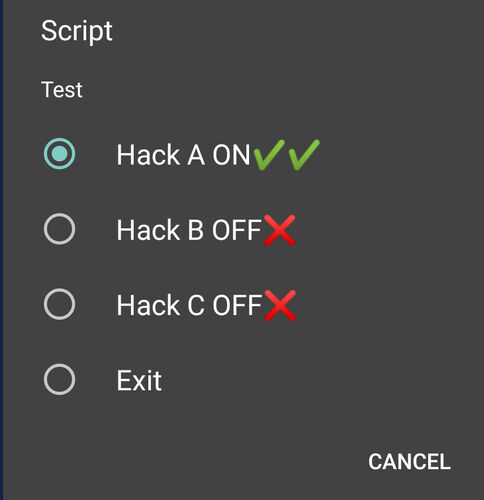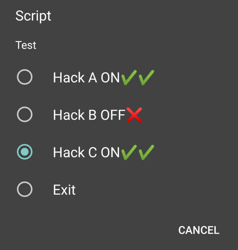 Making use of status of gg.choice to make on-off script. If you guys understand how to use table then making on-off script with this becomes very easy.