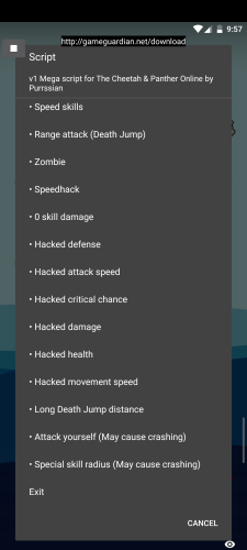 EDIT (February 17th, 2025): I am aware that this script has issues, I believe some of the temporary attribute hacks don't work for some odd reason (defense and critical chance if I remember correctly), zombie hack doesn't work etc etc. I was new to GG scripting and didn't think to test my script out throughly, however I do not plan on updating this script as I don't play The Cheetah nor Panther Online anymore.