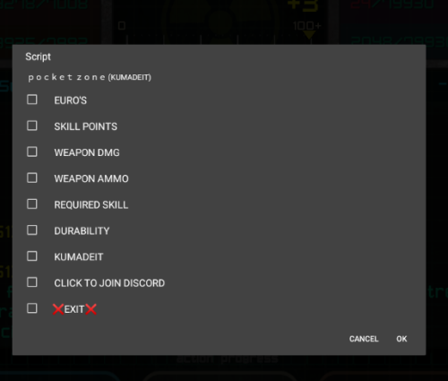 About This File POCKET ZONE MOD MENU 1. EURO'S 2.SKILL POINTS 3.WEAPON DAMAGE 4.WEAPON AMMO 5.REQUIRED SKILL 6.DURABILITY if you enjoyed the mod menu please leave a like would be much appreciated Edited March 2 by KUMADEIT