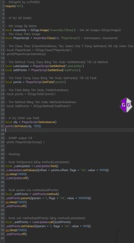 -- Retrieve image local Assembly = Il2Cpp.Image("Assembly-CSharp") -- Class retrieval local PlayerScript = Assembly:Class(nil, "PlayerScript") -- Method/Field local LateUpdate = PlayerScript:GetMethod("LateUpdate") local points = PlayerScript:GetField("points") -- Set field value local obj = PlayerScript:GetInstance() points:SetValue(obj, 1000) -- Dump class print(PlayerScript:Dump()) -- Hooking examples as above