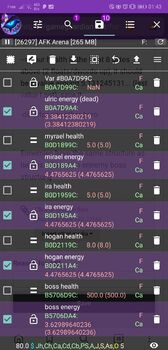 I found a quite fast way to find a hero health and energy. You can pause the game while in GG (up left corner button) to make the scan easier: -wait for the ultimate to be ready on your hero -search for float 4.4765625 (max energy) -launch ult. -quickly search for 0 after launching it, before your hero attacks again --> there should be one result in 'Ca' memory range, this is your energy, save it. -go to address --> your health is the float 8 bytes above (2 floats/dwords up), it should be a value around 5.131245131... (last value i got), save it. -do it for any other hero Ennemies have the same structure as heroes. I found an ennemy boss structure but it was far away from heroes' ones (the first value is Ulric health, but I couldn't rename it because the NaN value caused an error when I tried to rename (GG bug)): You can see on the next screenshot the difference between the 3 first offsets (between ulric and other heroes), and the ulric and the ennemy boss' offset (lightened offset). You can also see on the 5th, 6th and 8th lines that some heroes are closer than others: Mirael and Ira are separated by only C00h bytes/octets and Ira and Hogan are separated by 7C00h bytes:1 point