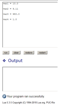 Again not a valid lua. I think you want use strings, but not use quotes. var1 = '10F' var2 = '9.11F' var3 = '980F' var4 = '1F' Or you want make it float like this var1 = 10.0 var2 = 9.11 var3 = 980.0 var4 = 1.01 point