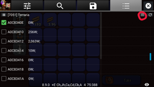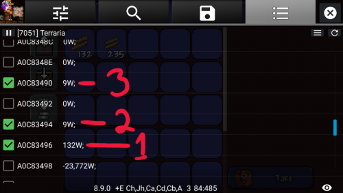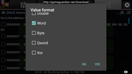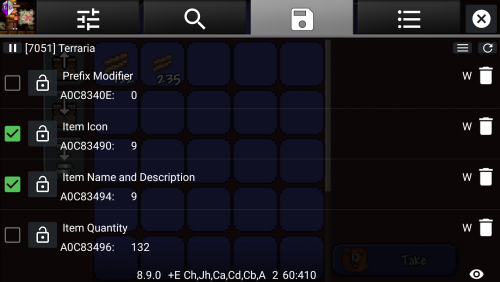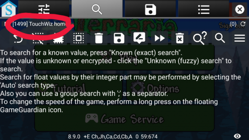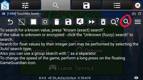 Guide:Mobile inventory editing (Android) Method 1: GameGuardian App info GameGuardian is an app that allow the editing of values in realtime(while playing). the app is very similar to the popular Cheat Engine for PC. Due to the way it edits values in running processes it requires root access. GameGuardian download location: Homepage THIS IS NOT A PLAYSTORE APPLICATION!! This app must be installed manually once downloaded to your device. You may have to allow installation "from unknown sources" in your device's settings to do this (image) The video here provides a basic visual tutorial on how to use the app to edit values in game. Video Description Items needed in game 1 Chest or Container of any type. On mobile, a barrel or trashcan are valid substitutions for a chest. It is advised you place the container close to your spawn point, as you will need to save and exit the world on completion. Any number of easily acquired block/item (Wood(any type), Dirt, Gel, etc.) Note: The more of the item you have, the easier it will be to find the value. Step 1. Download and Install GameGuardian: Download the apk file from the above webpage. Once downloaded, run the apk file. If this is your first time installing a non-playstore application, you will likely need to allow installation from unknown sources. See image 1 Once installed, open the app. You will be prompted to allow the app Super User Permission. Select Okay See image 2 After you provide permission, you will see a secondary installation taking place. This is a defensive installation that will prevent apps on your device from detecting GameGuardian's presence. There are a few apps that will not allow users to run them if a memory editor is present. GameGuardian gets around this by installing itself with a random process name. The name will be unique to your device See image 3. You will be prompted to allow Superuser permission to this installation as well. Note: this secondary installation is not mandatory and can be canceled. You may also refuse Superuser Permission on the second request. Refusing runs the risk of other apps on your device detecting GameGuardian. 1 2 3. This image will not be the same as yours Step 2. Preparation: Once the app has Superuser Permission, open Terraria and navigate to the main menu. Next, press your Home button on your device, leaving Terraria running. Open GameGuardian again and you should see a list of running applications. Navigate through the list and select Terraria. If the list does not automatically appear, you can open it by touching current process name in the top left corner. See image 4 Once you have directed GameGuardian to Terraria, minimize GameGuardian by pressing your Back button on your device. You can maximize it at any time by clicking the floating icon. You can also close it if necessary by opening the menu and choosing Exit Load your world in Terraria and acquire a container and a handfull of any item. Place the container close to your spawn point and deposit your chosen item into it. Maximize GameGuardian by pressing the floating icon. 4 Step 3. Finding your values: In the top right side of GameGuardian, press the magnifying glass icon(the one WITHOUT the question mark) See image 5. You should see a new widow pop up. In the empty value field, enter the quantity of your chosen item. You should also see a box with three "???". Press that box and choose "Word" Yours should look like image 6. Once done, press Search. On this first search you will likely have too many results to judge which is the one you need. Go back to Terraria and move your item from its current slot to any other slot. Once the item is moved, open GameGuardian again and do another search. This time the value you search for should be "ZERO" Alternatively, you can swap your first item with another that you have more or less of and search for that quantity instead See image 7. Repeat the search process until you only have one value in the results list. Once you have only one value, proceed to the next step. 5 6 7. Swap the dirt with the wood. Searching for the value of whichever is in the first chest slot. Step 4. Finding additional information: In order to be able to change what the item IS, you need to find two more values. No worries tho, the values for the item name and icon are stored in a static address directly next to your quantity. In the results list, long press on your value until a box of options pop up. Choose "Go to Address". On this screen, you will likely be overwhelmed by the amount of information on the screen. To simplify the view, Click the button with three lines directly next to the refresh circle in the top right See image 8. You will be presented with several options. Choose "Value Format" Uncheck all boxes with the exception of the "Word" box See image 9. Now that the values are easier to read, select the check box next to the one that matches your value, as well as the first and third values directly above yours(these two extra values should be the same) See image 10. One additional value is optional. You will only need it if you want to add Modifiers This guide will assume you chose to do this step Long press on the topmost value that you selected(value "3" in image 10) and choose "Offset Calculator" In the offset box, type -82 and press "GOTO" See image 11. Select the checkbox next to the topmost value on the list See image 12. Now that you have your four values marked, Click the top right button with three lines again(the one next to the refresh circle)See image 12 and choose "Save Values". Once you have sent the values to the saved list, press the icon at the top shaped like a floppy disk("What's a floppy disk?", you ask. Google it...) This will take you to a page with the values you saved displayed. The first value in this list is for the Prefix modifier. Rename this value "Prefix" OR "Modifier" by clicking the value and selecting the "Variable Name" box. Simply rename the variable without changi