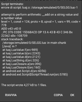 20. Redownloaded but i get same error bro Script terminato: errore di script: luaj.o: /storage/emulated/0/Download/SELGG.lua:-1 attempt to perform arithmetic __add on a string value and a number value level = 1, const = 119, proto = 8, upval = 1, vars = 99, code = 778 ADD v43 v43 0 ; PC 376 CODE 15D54ACD OP 13 A 43 B 43 C 341 Bx 22357 sBx -108714 stack traceback: /storage/emulated/0/Download/SELGG.lua: in main chunk [Java]: in ? at luaj.LuaValue.f(src:989) at luaj.LuaValue.b(src:2243) at luaj.LuaValue.d(src:2121) at luaj.LuaString.d(src:326) at luaj.LuaClosure.a(src:396) at luaj.LuaClosure.l(src:160) at android.ext.Script.d(src:6056) at android.ext.Script$ScriptThread.run(src:5785)