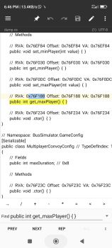 I have dumped a game libil2cpp.so Game Link : Bus Simulator Indoneshia 3.6.1 (old version) I have found RVA offset of setting the max number of player in multiplayer room. // RVA: 0x76F188 Offset: 0x76F188 VA: 0x76F188 public int get_maxPlayer() { } The default max player is 10. different Mod makers mod the number and create a room more than 10 players. I tried to go to the offset using Game Gurdian. But when I go to the adress it show a different number. The value must be 10. Here is my recording Screenrecorder-2024-12-30-18-41-28-137.mp4 I think may be I came in wrong adress. How to find the correct adress using RVA I also tried from my laptop emulator. There also came same problem. N:B: The 3.6.1 version of the game is famous for playing more player than 10 in multiplayer room. So I am also trying to make 1 Dump File of The Game : bussid 3.6.1 Dump.cs I tried other RVA offset of the game like setting the Min player in Room // RVA: 0x76F030 Offset: 0x76F030 VA: 0x76F030 public int get_minPlayer() { } The value should be 0. But when I go to there the value comes diffrerent in DWORD