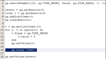You use sleep For me no any problem gg.setVisible(false) while true do if gg.isVisible() then gg.setVisible(false) local v = gg.alert('Action?', 'ON', 'OFF', 'EXIT') if v == 1 then revert = gg.getListItems(1) rev = gg.getListItems(6) t = gg.getListItems(10) for i, v in ipairs(t) do v.flags = gg.TYPE_DWORD v.value = 5 end gg.setValues(t) elseif v == 2 then gg.setValues(revert) gg.setValues(rev) else gg.setVisible(true) return end else gg.sleep(100) end end 2257_half_mute.mp4