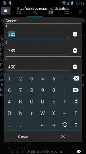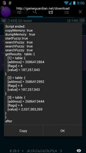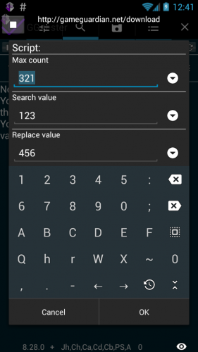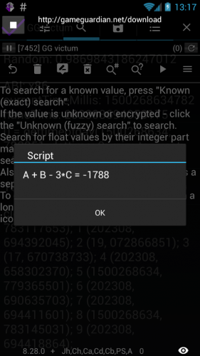 Yes. And can be created automated calculator/tool based on gg. Present function 'toast', 'alert' and 'prompt' which allow create some dialogs for user. For example 'Input gold amount:' and use this value for make search. data = gg.prompt({[1]='Search value', [2]='Replace value', [3]='Max count'}, {[1]='123', [2]='456', [3]='321'}) gg.searchNumber(data[1], gg.TYPE_DWORD, false, gg.SIGN_EQUAL, 0, -1) found = gg.getResultCount() gg.alert('We found: '..found) gg.getResults(data[3]) replaced = gg.editAll(data[2], gg.TYPE_DWORD) gg.alert('We replaced: '..replaced) gg.alert('Summary: We search '..data[1]..', found '..found..', replaced '..replaced..' to '..data[2]..' with max count '..data[3]..';') print('Script ended.')