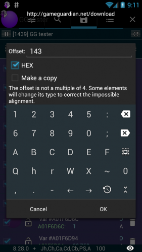 gg.toast ('Quadropus 2.0.48 Hack by Backlift') gg.clearResults() --gg.setRanges(gg.REGION_JAVA_HEAP) gg.setRanges(gg.REGION_C_ALLOC) while true do if gg.isVisible() then local d = gg.prompt({A='Number of Orbs Or Dooblins'}, {A='0'}) if d == nil then gg.alert('Script canceled') break end gg.searchNumber (d.A, gg.TYPE_DOUBLE, true, gg.SIGN_EQUAL, 0, -1) cnt = gg.getResultCount() if cnt == 0 then gg.alert('Search failed') break end if cnt == 1 then gg.editAll('100000000', gg.TYPE_DOUBLE) gg.alert('Hacking Done, Enjoy') break end gg.alert ('Go to game and change the value, then open gg to continue') gg.setVisible(false) end gg.sleep(100) end GameGuardian.git_signed.apk