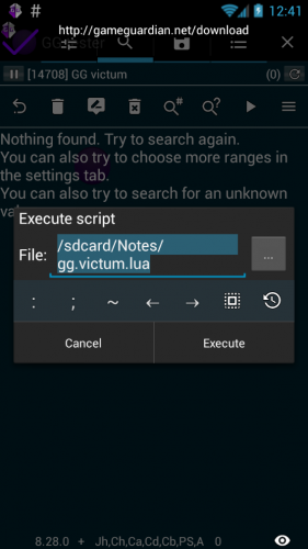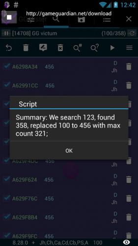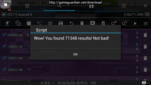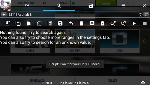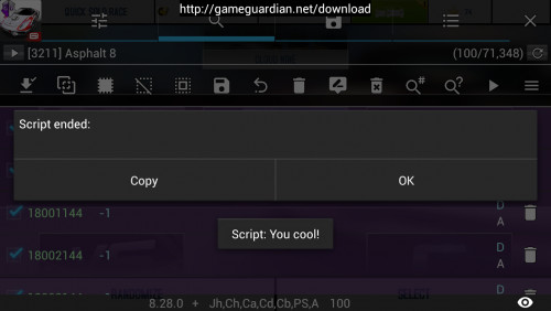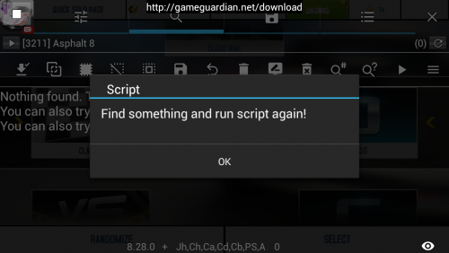 Script for hack Asphalt 8 nitro: gg.searchNumber('2;8;10;12;15;20;25;30:61', gg.TYPE_FLOAT, false, gg.SIGN_EQUAL, 0, -1) gg.getResults(100) print('Replaced: ', gg.editAll('1000', gg.TYPE_FLOAT)) print('Nitro hacked!')