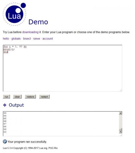 I will not teach anyone the basics of programming. For this, there are a lot of great sites and articles. Lua you can test online https://www.lua.org/cgi-bin/demo _______________________________________________ added 1 minute later for i = 1, 50 do print(i) end Simple loop for 50 iterations. _______________________________________________ added 1 minute later