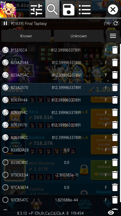 @NoFear CM13 ( 6.0.1) using CF Su Root On a Samsung Galaxy s4 And when does the ptrace come? Btw Gold Float (Unknown) Diamonds Normal Dword (lol) Keys to open treasures Dword Damage Float Level Float Awakening Stones Dword Stages 2 diffrent Dword Not gonna lie this is the most fun game to hack its somehow pretty interresting