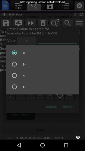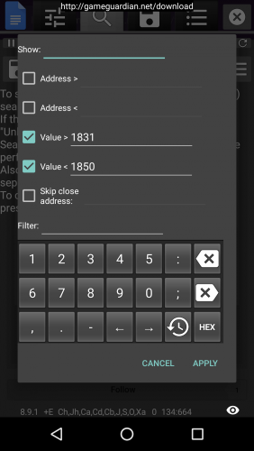 Yes, possible with GameGuardian. In 2 ways even. Nr. 1 Known value Press on the "=" to open up this interface = is known != is it isn't this value (for example you have 10000 0's but you know your value isn't that) < is Value lower than x > is Value higher than x Nr.2 Filter Press menu and open filter Fill in your values and check the according checkbox.