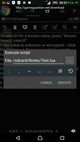 I have faced a problem now. My code is this: d = gg.prompt({A='Number of Orbs Or Dooblins'}, {A='0,}) gg.toast ('Quadropus 2.0.48 Hack by Backlift') gg.setRanges ( gg.REGION_C_ALLOC) gg.searchNumber (data[A], gg.TYPE_DOUBLE, true, gg.SIGN_EQUAL, 0, -1) if gg.getResultCount() == 1 then gg.editAll('100000000', gg.TYPE_DOUBLE) gg.alert ('Hacking Done, Enjoy) else gg.alert ('Go to game and change the value, then load the script again to continue') end Theorically it should: 1_open a prompt screen to user to get value and meanwhile, toast a message 2_after value input, set range to (Ca) and search the value as Encrypted Double 3_if found 1 value Change it to a very high number, if not, tell user to change the value and reload script But I get errors: Script ended: Script error: org.luaj.vm2.LuaError: load /sdcard/Notes/Quadropus 2.0.48 Script by Backlift.lua: org.luaj.vm2.LuaError: /sdcard/Notes/Quadropus 2.0.48 Script by Backlift.lua:1: unfinished string at org.luaj.vm2.LuaValue.error(LuaValue.java:1051) at org.luaj.vm2.Globals.loadfile(Globals.java:185) at android.ext.Script.runScript(Script.java:1035) at android.ext.Script.access$8(Script.java:1032) at android.ext.Script$ScriptThread.run(Script.java:998) Caused by: org.luaj.vm2.LuaError: /sdcard/Notes/Quadropus 2.0.48 Script by Backlift.lua:1: unfinished string at org.luaj.vm2.compiler.LexState.lexerror(LexState.java:266) at org.luaj.vm2.compiler.LexState.read_string(LexState.java:451) at org.luaj.vm2.compiler.LexState.llex(LexState.java:611) at org.luaj.vm2.compiler.LexState.next(LexState.java:673) at org.luaj.vm2.compiler.LexState.checknext(LexState.java:822) at org.luaj.vm2.compiler.LexState.recfield(LexState.java:1129) at org.luaj.vm2.compiler.LexState.constructor(LexState.java:1167) at org.luaj.vm2.compiler.LexState.simpleexp(LexState.java:1418) at org.luaj.vm2.compiler.LexState.subexpr(LexState.java:1523) at org.luaj.vm2.compiler.LexState.expr(LexState.java:1541) at org.luaj.vm2.compiler.LexState.explist(LexState.java:1261) at org.luaj.vm2.compiler.LexState.funcargs(LexState.java:1278) at org.luaj.vm2.compiler.LexState.suffixedexp(LexState.java:1373) at org.luaj.vm2.compiler.LexState.simpleexp(LexState.java:1427) at org.luaj.vm2.compiler.LexState.subexpr(LexState.java:1523) at org.luaj.vm2.compiler.LexState.expr(LexState.java:1541) at org.luaj.vm2.compiler.LexState.explist(LexState.java:1258) at org.luaj.vm2.compiler.LexState.assignment(LexState.java:1636) at org.luaj.vm2.compiler.LexState.exprstat(LexState.java:1958) at org.luaj.vm2.compiler.LexState.statement(LexState.java:2055) at org.luaj.vm2.compiler.LexState.statlist(LexState.java:2072) at org.luaj.vm2.compiler.LexState.mainfunc(LexState.java:2088) at org.luaj.vm2.compiler.LuaC$CompileState.luaY_parser(LuaC.java:129) at org.luaj.vm2.compiler.LuaC$CompileState.access$0(LuaC.java:120) at org.luaj.vm2.compiler.LuaC.compile(LuaC.java:99) at org.luaj.vm2.Globals.compilePrototype(Globals.java:304) at org.luaj.vm2.Globals.loadPrototype(Globals.java:283) at org.luaj.vm2.Globals.load(Globals.java:254) at org.luaj.vm2.Globals.loadfile(Globals.java:183) ... 3 more
