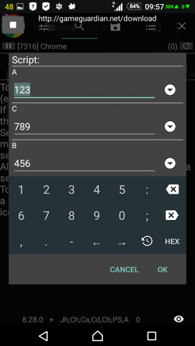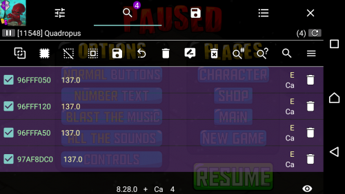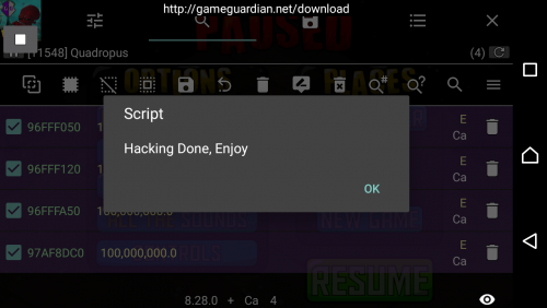 I'm working on hack for Quadropus Game. I made it to hack the input value as double and Encrypted. But I'm stuck in this situation: The user needs get back into game and change the value and then come back GG and enter the new value. Will this work? : print('go to game and change the value and then load script again') So it loads the script again and it search in the found results...or it makes a new search? _______________________________________________ added 3 minutes later I want to make an IF Statement: 1_If found 1 value, edit value to 10000000000 2_if Not found 1 value, print'('go to game and change the value, then load the script again') Possible? If yes, how?