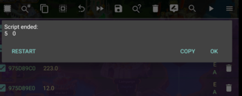 Hello, I would like to Open 3 issues : one critical bug in last version, one major bug in all tested version, and one request for explication and improvement. All of this is related with the following lua script for gg : function searchNSave(input) gg.searchNumber(input.search, gg.TYPE_DOUBLE, false, gg.SIGN_EQUAL, 0, -1) local r = gg.getResults(input.maxresults, nil, nil, nil, nil, nil, nil, nil, nil) local str = '' for i,v in ipairs(r) do if v.value ~= input.stars and v.value > 0.9 and v.value < 5.1 then local f = {} f[1] = {} f[1].address = v.address f[1].flags = v.flags f[1].name = input.name..' ('..i..') '..v.value gg.addListItems(f) str = str ..' '.. v.value end end gg.toast(input.name..':'..str) end local heros = {} local nb = 0 nb = 1 heros[nb] = {} heros[nb].name = 'Alice' heros[nb].stars = 3 heros[nb].search = '12;249;3;56;1;1;1;7;12;56;223;244;12;1;56;226;12;247;56;184;1;12;56:1057' heros[nb].maxresults = 23 nb = 2 heros[nb] = {} heros[nb].name = 'Bob' heros[nb].stars = 3 heros[nb].search = '8;3;197;3;56;3;4;7;56;319;182;58;1;246;70201;56;8;247;56;153;1;240;58;56:1121' heros[nb].maxresults = 25 nb = 3 heros[nb] = {} heros[nb].name = 'Carol' heros[nb].stars = 3 heros[nb].search = '8;3;197;3;56;3;5;7;440;56;221;58;1;220201;261;56;319;58;247;56;68;3;58;56:1121' heros[nb].maxresults = 25 nb = 4 heros[nb] = {} heros[nb].name = 'Dave' heros[nb].stars = 3 heros[nb].search = '8;3;209;3;56;3;7;56;221;58;1;20201;219;56;58;247;56;15;3;58;56:1025' heros[nb].maxresults = 22 for i,hero in ipairs(heros) do -- gg.clearResults() gg.toast(i..'/'..nb..': '..hero.name..' (stars='..hero.stars..')...') searchNSave(hero) gg.sleep(500) end 1st issue; critical bug: This script worked fine with version 8.69.1 but with th last version (70.2) the call "gg.addListItems(f)" in the "searchNSave" function do nothing ! (Then i have had to downgrade to 8.69.1). 2nd issue, major bug: If "gg.clearResults()" is uncommented, the following "gg.searchNumber()" will do nothing exactly half of the time. Always calling gg.clearResult() before gg.searchNumber() is an undocumented workaround to avoid this bug which could be easily fixed by including gg.clearResults() in the beginning of gg.searchNumber(). 3rd issue, request for explication/improvment: The "search" strings are generated by an other (bash) script who extract data from some files written by the game. Then we notice they may contain the same value more than once. I have notice it may not be useful as gg always result all occurrences of a searched value in its range, and it seems to only increase the time of search. Is is exact ? May you improve the group search feature by introducing eventual {} for each number, to permit to precise the (range of) occurrence of a searched value in the range. eg: '8{3};15;2014{2~5}:1025' will search for exactly 3 times a '8', any numbers of '15' (default = {1~} = from 1 to infinite), and beetween 2 and 5 times a '2014'. Then you may improve this feature to always rewrite search string to it's optimized form, eg: '2;56;7;56;220201;56;311{1~5};203;56;311;56:801' -> '2;7;56{4~};203;311{2~5};220201:801' That's all. PS: where to submit my lua scripts to hack games with GG ?