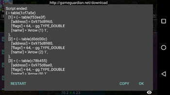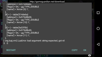 -- Script to search and freeze up to 5 decreasing values (eg: hp, mp, etc.) -- in games written also in Lua language. -- This script use the fact that lua numbers are always stored as double -- and followed by 3D, cf. src/lua.h in its source code. -- Sometimes you won't find the exact value your are looking for (eg: there are different way to write the same double value or the value displayed is truncated). -- Then you can also set a margin for each one of the 5 values. How to use: look for the values you would like to freeze (eg. health points or mana points indicated in your game) pause the game (u may use autopause from the game guardian's main menu) store these values through the edit menu restart the script and select search and freeze. Once the search are finished go back to your game and play : script will auto detect and freeze the values you registered before. -