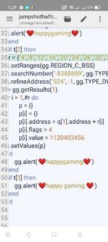 Please help how to freeze offsets edited values! Pls r = {"4","8","12","16","20","24","28","32","36","40","44","48","52"} gg.setRanges(gg.REGION_C_BSS) gg.searchNumber("-8388609", gg.TYPE_DWORD, false, gg.SIGN_EQUAL, 0, -1, 0) gg.refineAddress("524", -1, gg.TYPE_DWORD, gg.SIGN_EQUAL, 0, -1, 0) q = gg.getResults(1) for i = 1,#r do p= {} p = {} p.address = q[1].address + r p.flags = 4 p.value = 1120403456 gg.setValues(p) end