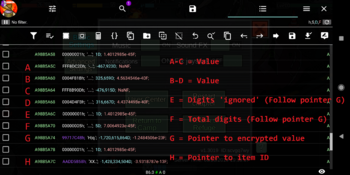 ***Please consider donating to my PayPal: [email protected]*** This took a lot of time to figure out. Then even more to create this much information and map many of these ids for everyone. And PLEASE.... If you plan on reposting or doing a guide based on this, I ask that credit is given to me. Enjoy!!!! To start searching for a value, you can first try doing 0x4 dword search. When value changes, unknown changed. Then search 0x4 again. Do this a few times until you can scroll through and find 2 values. Where the value above minus the value below it equal the quantity of the item you are searching for. This method isn't a definite. If you look at picture "Main" you can see that sometimes the values A and B DO NOT match. Which means the 0x4 will not work. The other method is to do a utf16 text search using item id and the quantity. The best time to do this is when you first open the game. So if you have 21 basic health packs, the search will be ";hp1*21". Usually goto first result result and pointer search. Then when you goto address, look above for the value structure like you see in "Main" picture. The next 2 Dword values in "Main", E and F. E is how many digits at the end of the encrypted value to ignore. F is how many digits total the encrypted value is. So if you have 20 of something. Values below could be, 0 and 2. Or 1 and 3, or 2 and 4.... Then the pointer "G", is the encrypted value. It's utf16, and the key to the encryption is this: M = 9 B = 8 N = 7 Q = 6 E = 5 W = 4 Z = 3 X = 2 D = 1 L = 0 So, if you have 549 of something, it will be E.W.M. But you might see something like E.W.M.L.L which would make you think you have 54900. But if you look at the values "E and F", it would be 2 and 5. Telling you its ignoring the L.L. at the end. Now for the edit... I ALWAYS click pause at the top right of game to ensure value doesn't somehow change while I am working on it. So values "A and B" I try to keep "original". YOu might be able to set these to 0 and edit the values "C and D" and be negative the value you want. In my video, I keep them untouched. After you edit that. Need to make sure encrypted value matches and the "total digits and digits ignored" all are correct for the value you want. ANYTHING DONE WRONG = INSTANT BAN. Make sure you did everything CORRECT before resuming game. Item changing: I would try finding item via quantity or item id/quantity. Then goto pointer "H". Here will be the item id. The basic health pack is "hp1". YOu could just edit the 1 to a 4 and have a value in you backpack change then restart game. Those health packs will become the big red health packs. If you are looking to change in from health pack to a Red Saber Crate, I recomend doing a utf16 search for the item id you want. Go through results look for the 'correct' value like I do in video. Copy address of the "header" for that id. Then edit pointer "H" and paste that address and put h after it. So if address is AABBCCDD, then you'll dword edit it to AABBCCDDh. Have something in backpack change and restart game. Those health packs will now become Red Saber Crate. I went through and mapped out MANY items already. If you want SPECIFIC materials/items, I'll provide a list of "ids" and you can sort through them to determine which is what. I'll explain the naming scheme though of gear. One weapon is "near". Which is melee. so, near#1_#2_#3. #1 is the equipment id. #2 is the level of the equipment. and #3 is the rarity. I THINK near6_200_7 would be a red saber level 200. Video Guide: Health item ids: hp1 to hp9. hp4 is the big red health pack. Food: food1 to food16 Water: water1 to water7 Here is the "other" items list. This is probably all you really need for most things. ID Item Description other2 Gold other3 Coins other4 Standard Equipment Box Contains a Blue quality or above equipment. other5 Standard Weapon Box Contains a Blue quality or above weapon other6 Advanced Equipment Box 50% chance to gain an Orange Equipment. other7 Advanced Weapon Box 50% chance to gain an Orange Weapon other8 R&D 1min bost Reduces current R&D time. other9 R&D 5min boost Reduces current R&D time. other10 R&D 15min boost Reduces current R&D time. other11 R&D 1hr boost Reduces current R&D time. other12 R&D 3hr boost Reduces current R&D time. other13 5min Accelerator Reduces time for Refuge upgrade or survivor missions. other14 15min Accelerator Reduces time for Refuge upgrade or survivor missions. other15 30min Accelerator Reduces time for Refuge upgrade or survivor missions. other16 1hr Accelerator Reduces time for Refuge upgrade or survivor missions. other17 3hr Accelerator Reduces time for Refuge upgrade or survivor missions. other18 Perk Rebooter Resets all perk points other19 Common Pet Box Contains a Green quality or above pet. other20 Rare Pet Box Contains a Blue quality or above pet. other21 Epic Pet Box Contains a Purple quality or above pet. other22 Legendary Pet Box Contains a Gold quality or above pet. other23 Artifact Pet Box Contains a Orange quality or above pet. other31 Common Attachment Box Contains a random White attachment. other32 Uncommon Attachment Box Contains a random Green Attachment. other33 Rare Attachment Box (Blue) other34 Epic Attachment Box (Purple) other35 Legendary Attachment Box (Gold) other36 Artifact Attachment Box (Orange) other37 Double EXP Card +100% boost for 15min other38 Orange Equipment Box Contains an orange Equipment other39 Orange Weapon Box Contains an Orange Weapon other40 ***Don’t use this for item swap*** ***Item will be deleted from inventory*** other41 Motorcycle Key other42 Zombie Lair Map A map that marked the lair of the zombies. This map grants access to the Zombie Lair for once. other44 ***Don’t use this for item swap*** ***Item will be deleted from inventory*** other45 Follower’s Perk Rebooter Use to reset current Follower’s Perk. other46 Discount Ticket Super great deal to have a 45% discount on the Pass! other47 Advanced Discount Ticket Super great deal to have a