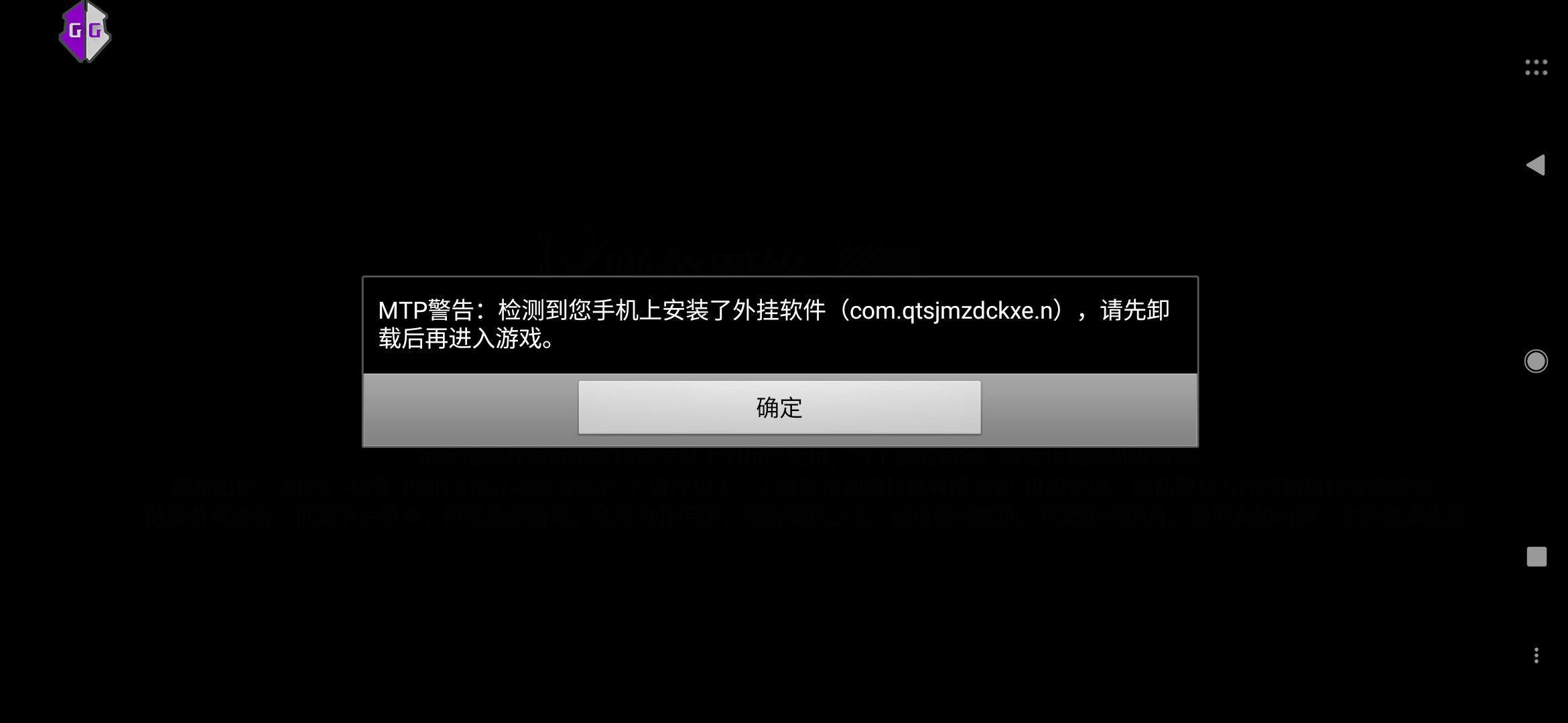 MTP警告:检测到您手机上安装了外挂软件(com.qtsjmzdckxe.n),请先卸载后再进入游戏。